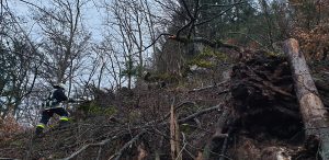 Durch einen umstürzenden Baum ist ein lockerer Fels auf die Fahrbahn gerollt. Fels wurde sicher am Straßenrand deponiert und die Fahrbahn gereinigt. Außerdem wurde der Hang nach weiterem losen Gestein begutachtet, dieses wurde kontrolliert vom Hang entfernt.